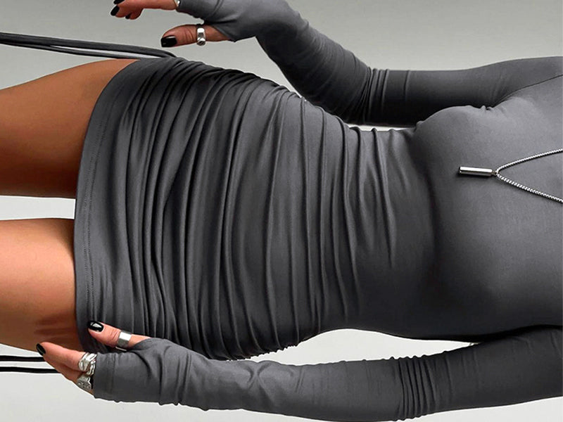 Solid Crew Neck Drawstring Shirred Mini Dresses